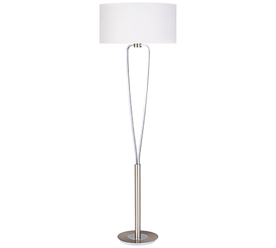 The high-quality PARIS II floor lamp has a modern design and creates a cosy ambience. The brushed nickel base and the two-part chrome shaft are combined with a white shade made of elegant fabric. The switch for switching the floor lamp on and off is located under the shade holder and the lamp has a height of 160 cm and the lampshade has a diameter of 35 cm. The E27 socket can be fitted with a light source of your choice with a maximum output of 60 watts.