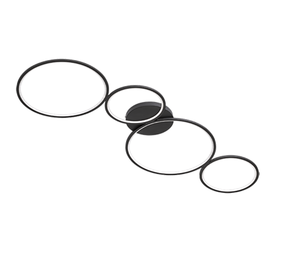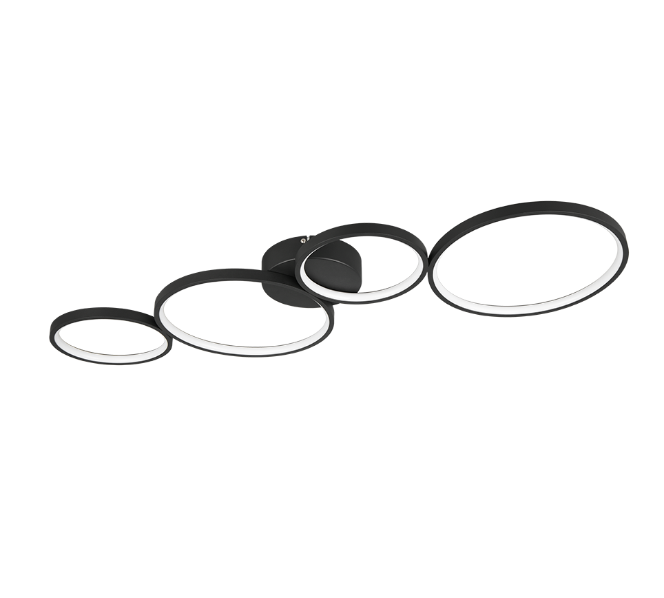 Díky čtyřem vzájemně propojeným prstencům o různých průměrech je stropní svítidlo RONDO skutečným poutačem pozornosti. Stropní svítidlo má integrovaný stmívač, který se ovládá pomocí vypínače. To umožňuje flexibilní nastavení jasu LED diod instalovaných na vnitřních stranách každého kruhu. Stropní svítidlo o šířce 97 cm je skutečným dekorativním prvkem a stylově vylepší každý obytný prostor. Díky matně černému barevnému provedení lze světlo kombinovat s mnoha styly interiérového designu. Svítidlo navíc disponuje moderní LED technologií, která se vyznačuje vysokou kvalitou světla a energetickou účinností. Ve srovnání s běžnými halogenovými žárovkami lze ušetřit až 80 % nákladů na energii. LED světelné zdroje mají navíc dlouhou životnost, produkují méně tepla a jsou šetrné k životnímu prostředí.