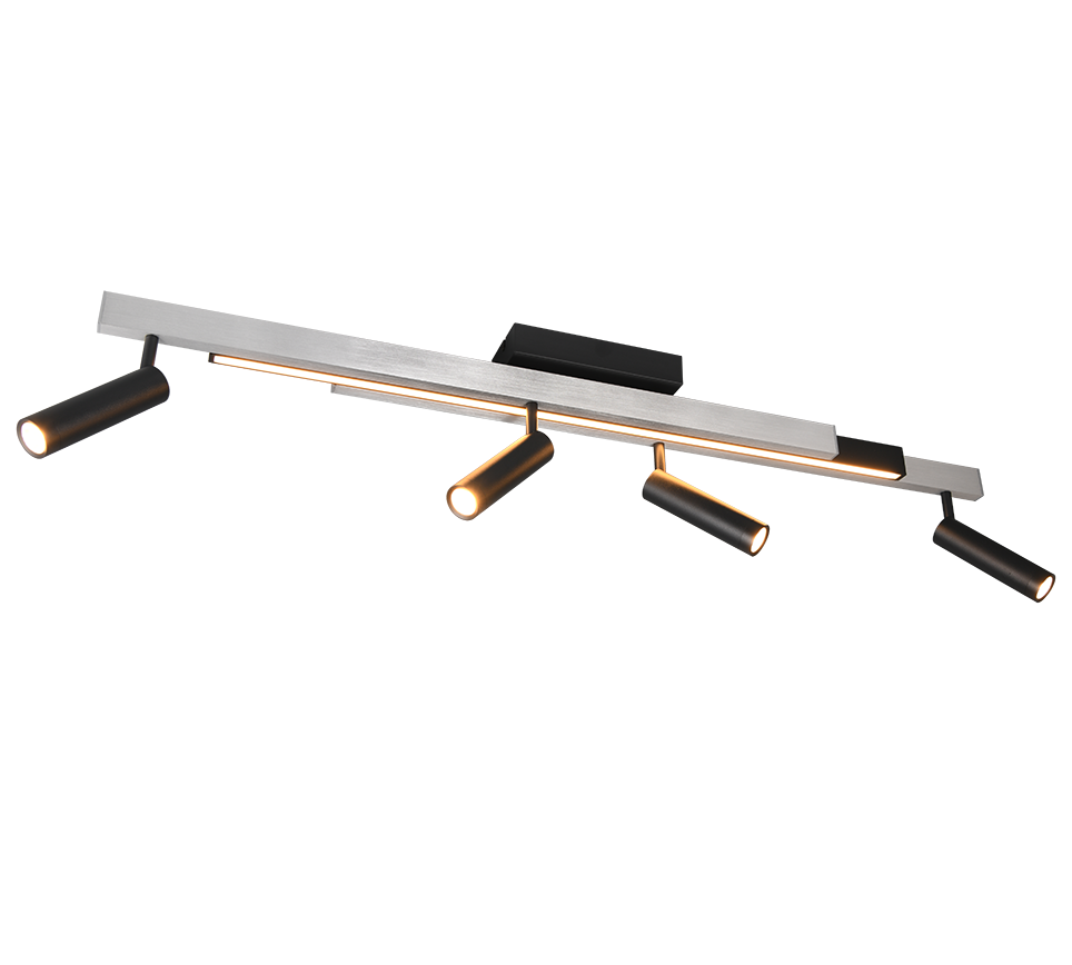 Všestranné osvětlení ve stylovém designu - Stropní svítidlo ZENO zaujme třemi rovnoběžnými, protáhlými prvky, které lze snadno od sebe oddělit a přizpůsobit tak světlo vašim potřebám a místnosti. Čtyři pohyblivé bodové světlomety navíc nabízejí další možnosti cíleného osvětlení vašeho obytného prostoru. Dodávané dálkové ovládání umožňuje pohodlné ovládání barvy a jasu světla na dálku. Kombinace kartáčovaného hliníku a černého matného kovu dodává světlu elegantní a moderní vzhled. Svítidlo je také vybaveno moderní LED technologií, která se vyznačuje vysokou kvalitou světla a energetickou účinností. Ve srovnání s běžnými halogenovými světelnými zdroji lze ušetřit až 80 % nákladů na energii. LED světelné zdroje mají také dlouhou životnost, produkují méně tepla a chrání životní prostředí.
